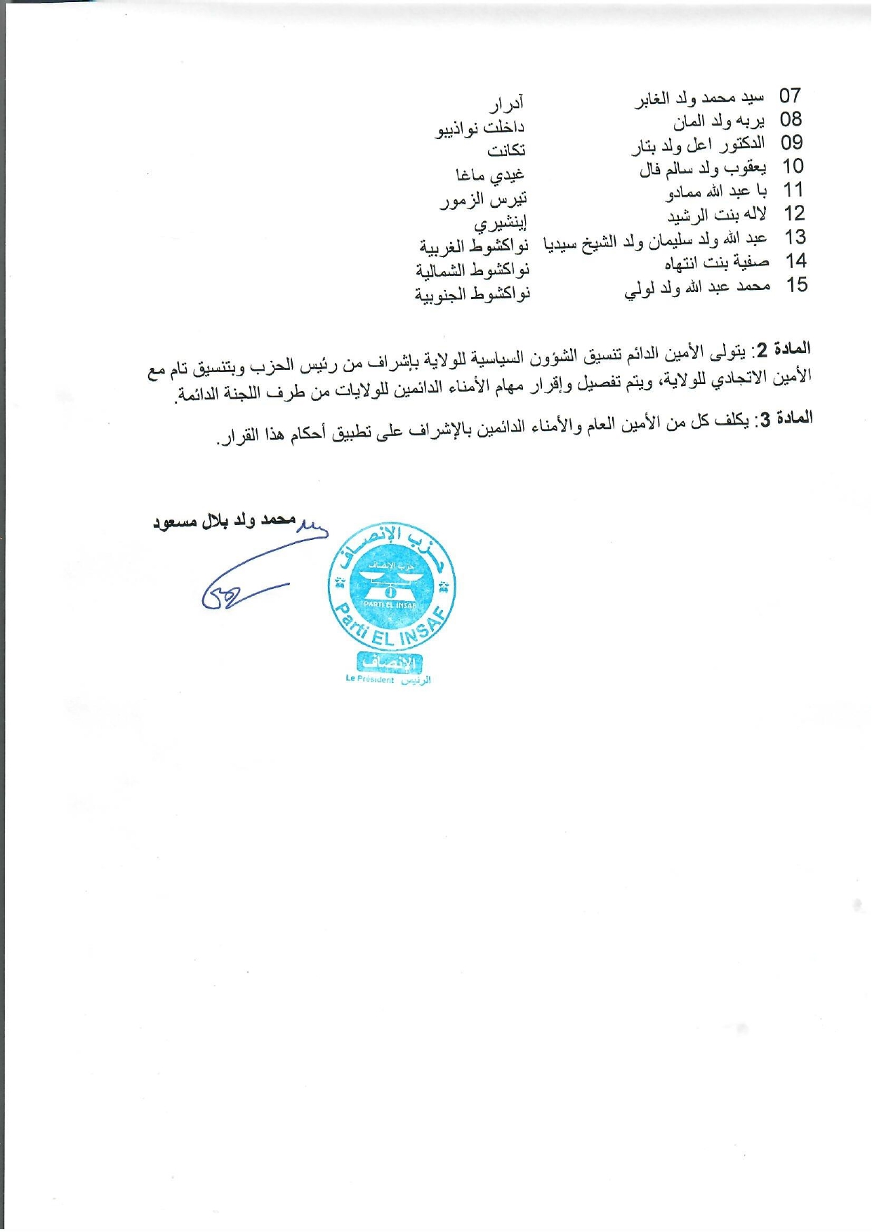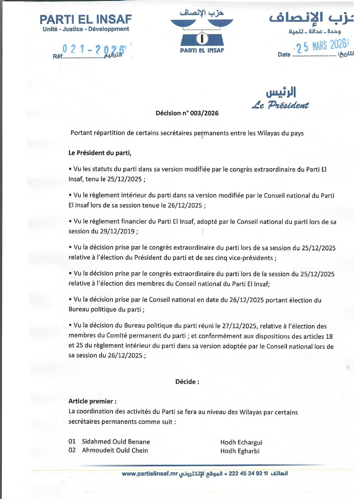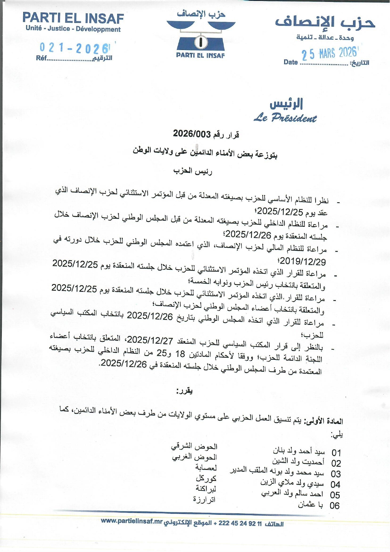 رئيس الحزب يصدر مذكرة بتوزيع الأمناء الدائمين على بعض ولايات الوطن