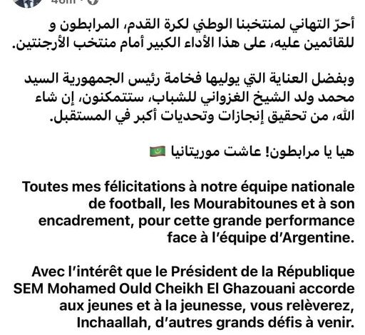 أحرّ التهاني لمنتخبنا الوطني لكرة القدم، المرابطون و للقائمين عليه، على هذا الأداء الكبير أمام منتخب الأرجنتين.